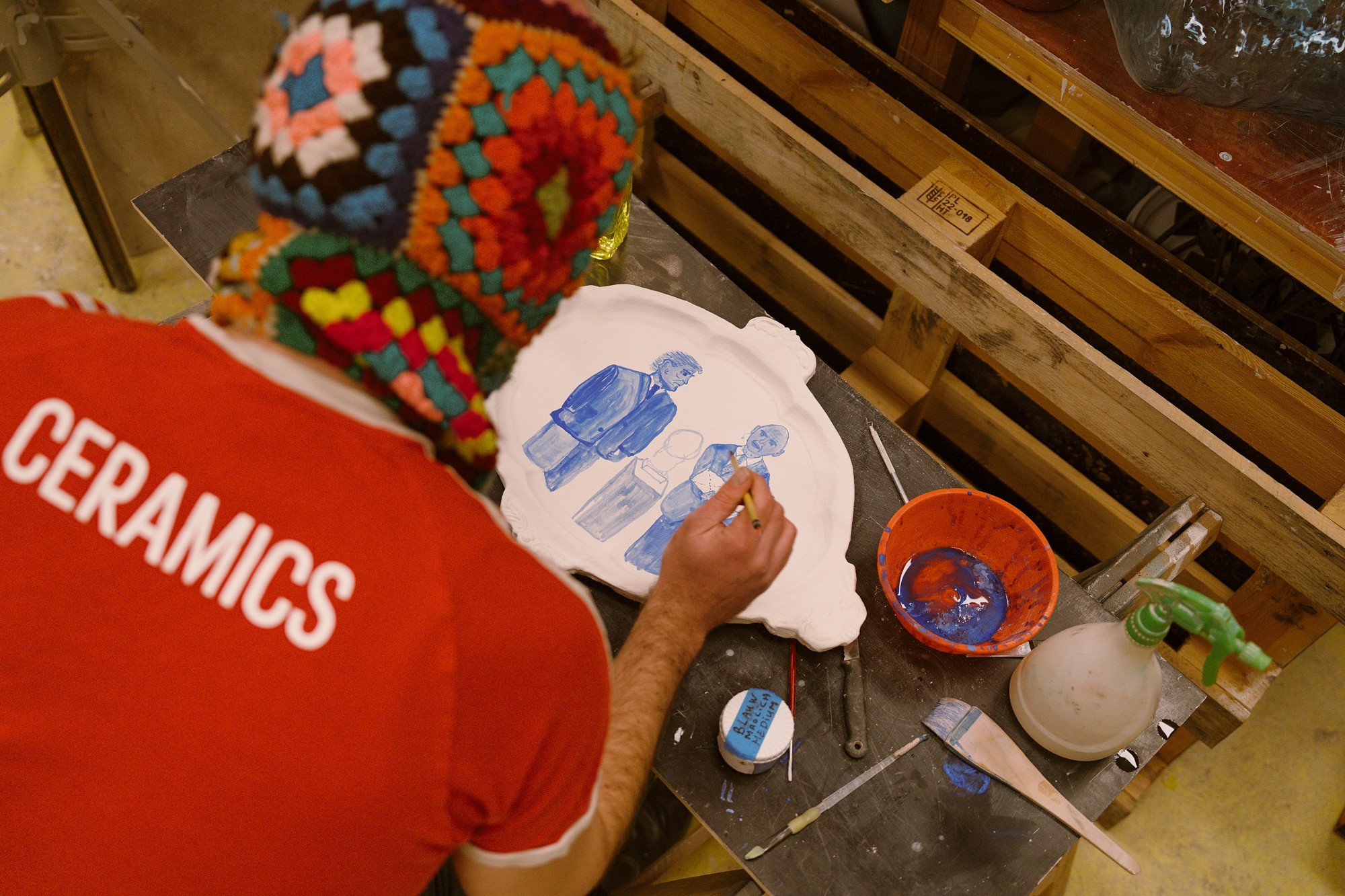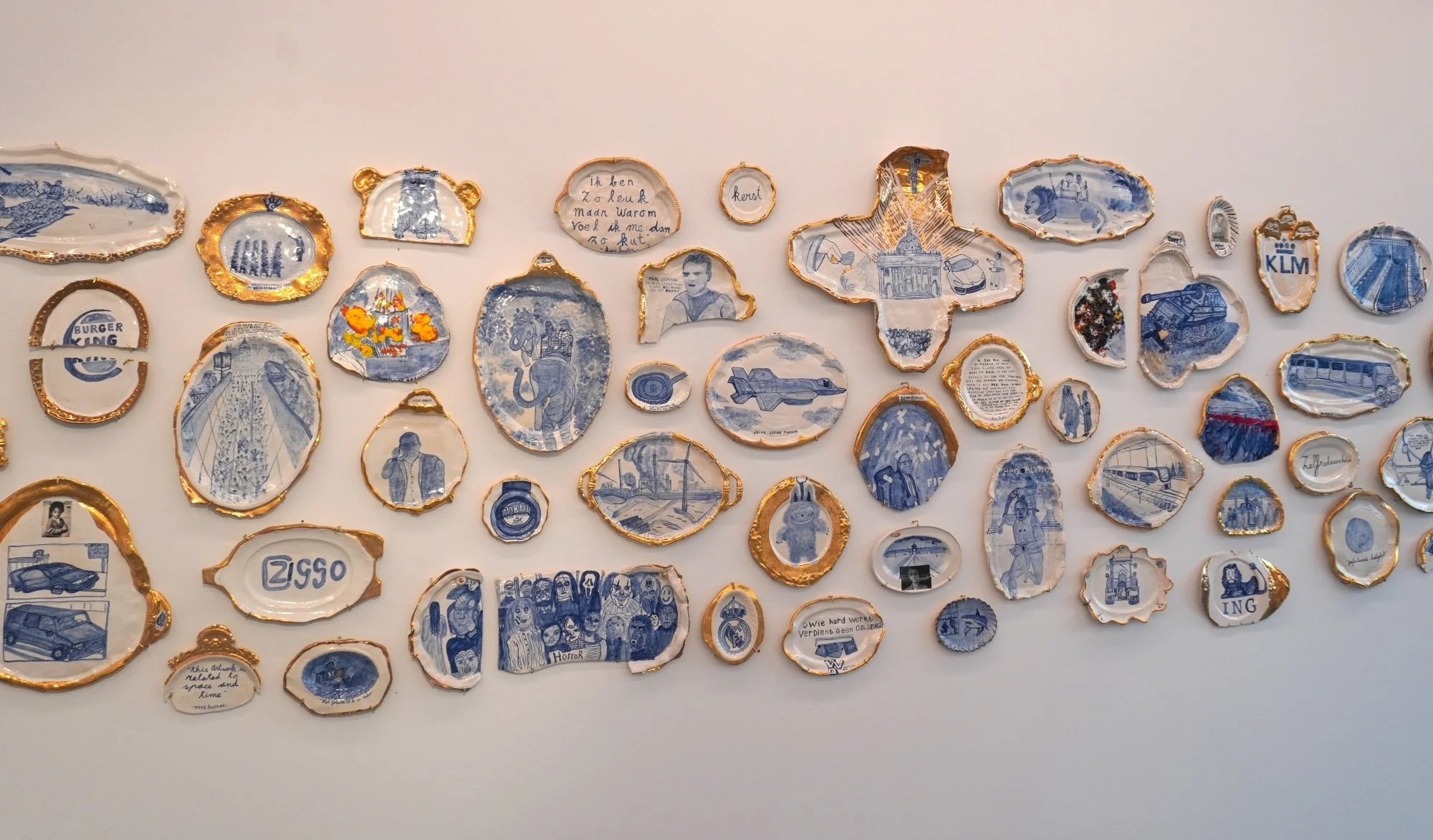At the heart of the exhibition are more than 150 ceramic decorative plates from the series 'Sierborden van alles dat ik niet leuk vind': an encyclopedic overview of all that Koos Buster does not like. By immortalizing aversion in ceramic, Buster transforms irritation into something precious. The negative is cherished; the trivial is elevated. The exhibition also presents a series of ceramic books. Due to his dyslexia, reading never came naturally to Koos Buster. Every book he has ever read, he has remade in clay, not as a display of prestige, but with pride. Look, this is all I have read. A Love Supreme further includes a range of objects and installations: cabinets filled with cleaning bottles titled after musical albums that inspire him, tables, key cabinets, security cameras, and the Button for World Peace.